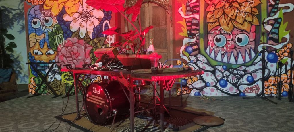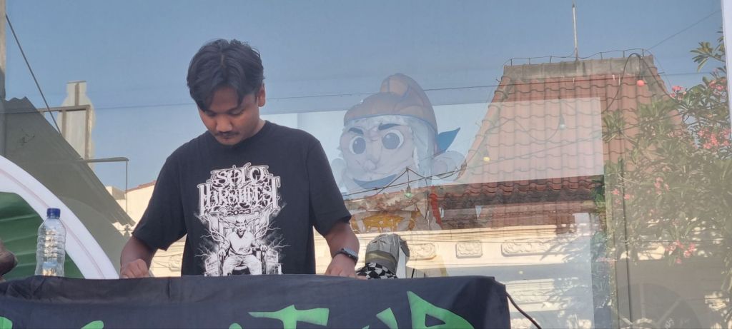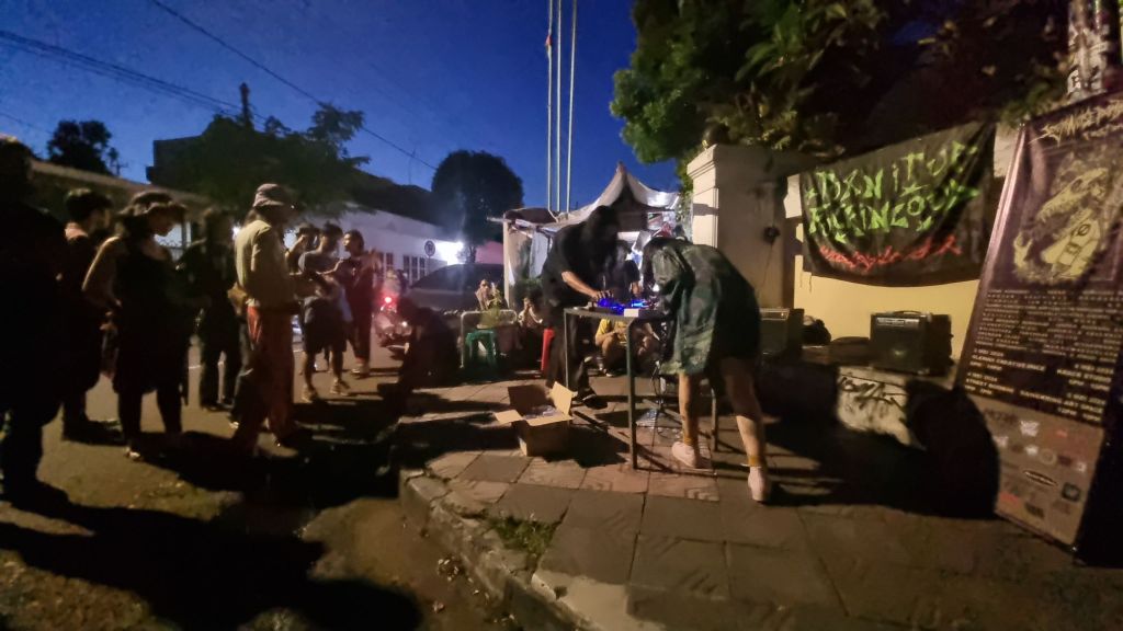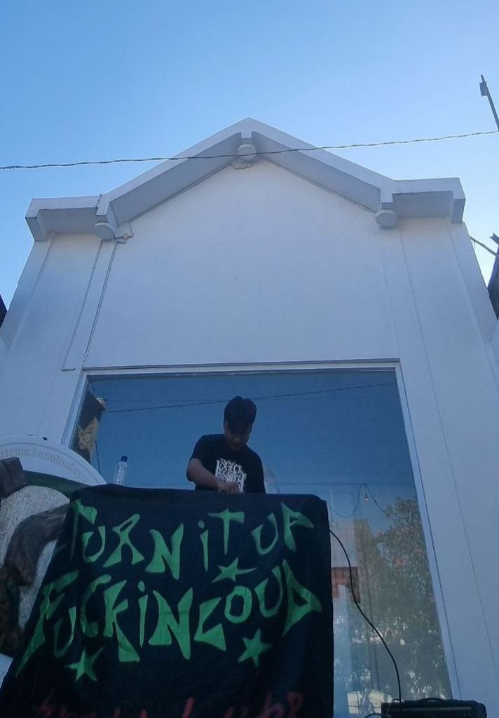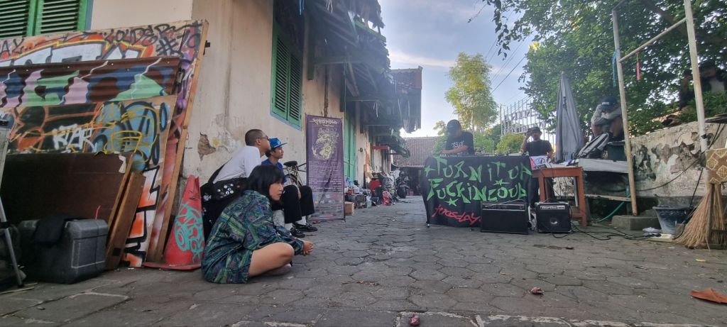 A stage is set into an alcove, a small courtyard of an abandoned shop. A table is loaded with gear, power comes from who-knows-where, and sound comes from two guitar amps. Three acts play the first location, each presenting fresh ideas through noise. The locals look on, but no one seems perturbed in the slightest. What’s happening here is just another thing in the life of the beast Jogja.